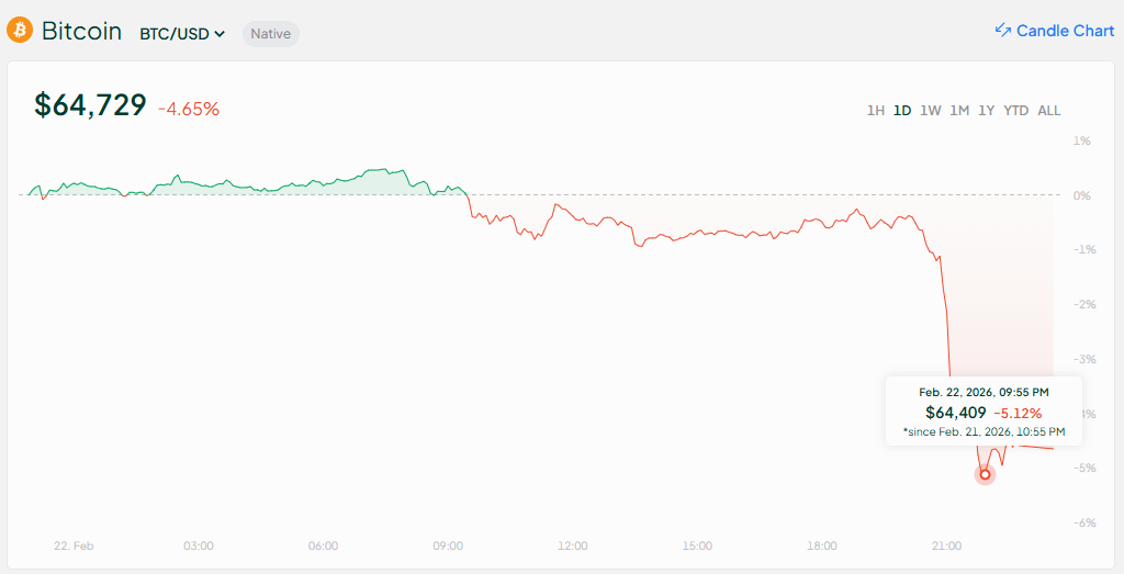 On a somber Sunday eve, the illustrious Bitcoin made a fateful plunge of over $2,500, slipping beneath the hallowed threshold of $65K. This descent, dear reader, is a consequence of investors bracing themselves for the tempestuous winds of a new global 15% tariff regime, whimsically orchestrated by none other than President Donald Trump. Ah, and let us not forget the specter of conflict with Iran, casting its ominous shadow over risk markets like a dark cloud at a summer picnic.