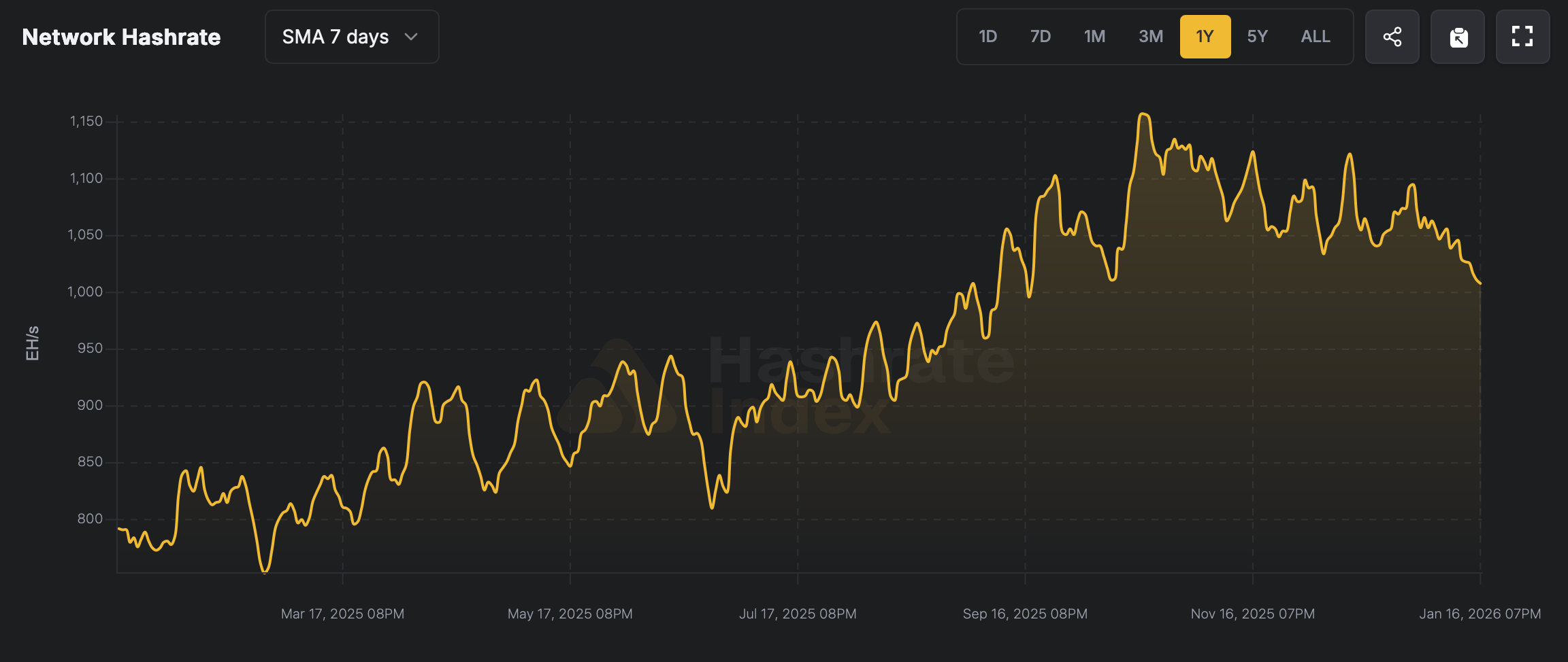 Bitcoin’s overall hashrate slipped beneath the 1 ZH/s zone on Saturday, Jan. 17, snapping a streak that had held firm above that mark since mid-September 2025. During that stretch, on Oct. 19, 2025, Bitcoin’s hashpower climbed to 1,162 EH/s-equal to 1.162 ZH/s-based on the seven-day simple moving average, according to hashrateindex.com data.