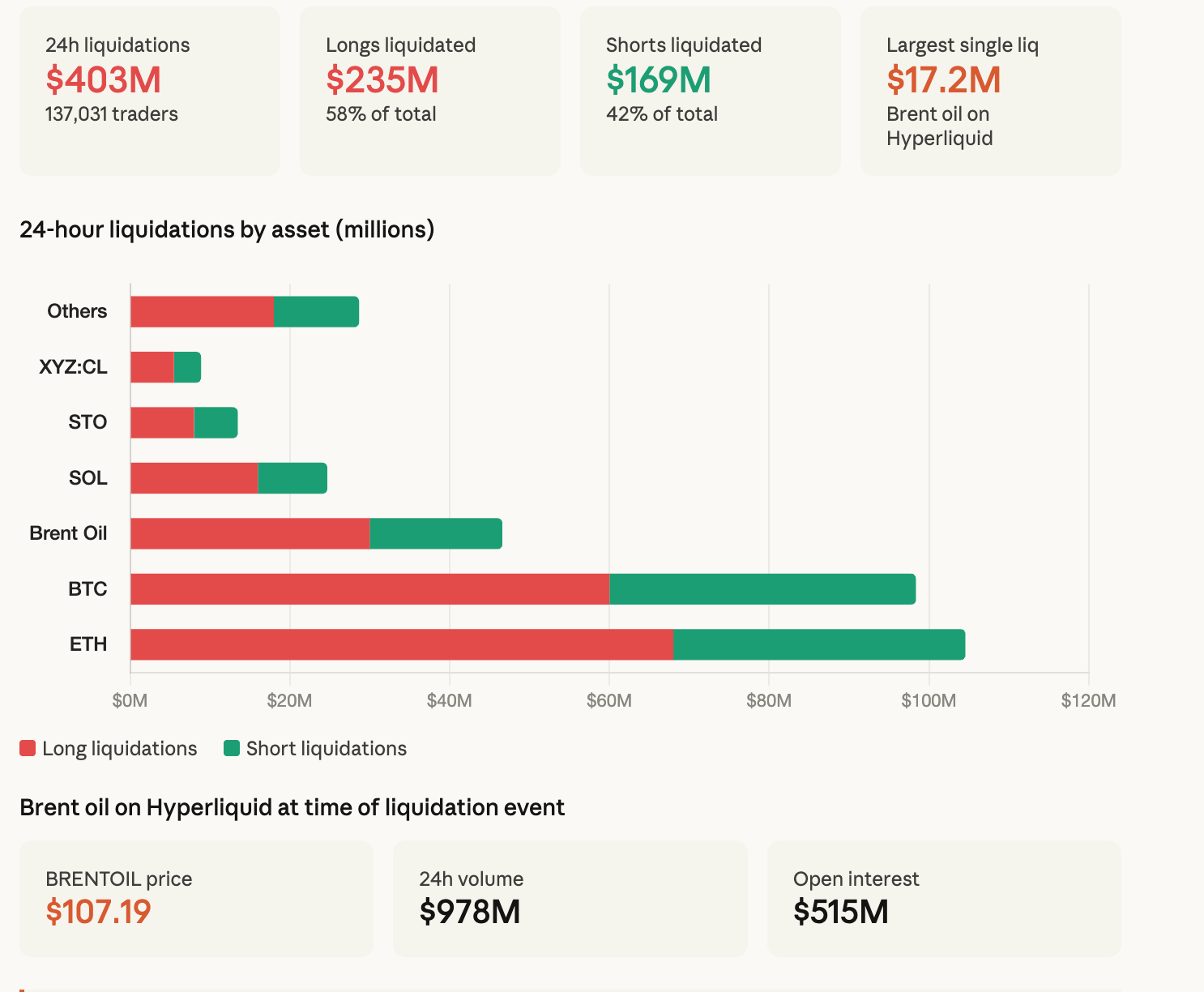 - Ah, the fickle dance of tokenized Brent oil futures on the Hyperliquid exchange! They have outshone even the venerable ether and bitcoin, driving $46.6 million of the $403 million in liquidations over 24 hours. A spectacle, indeed.