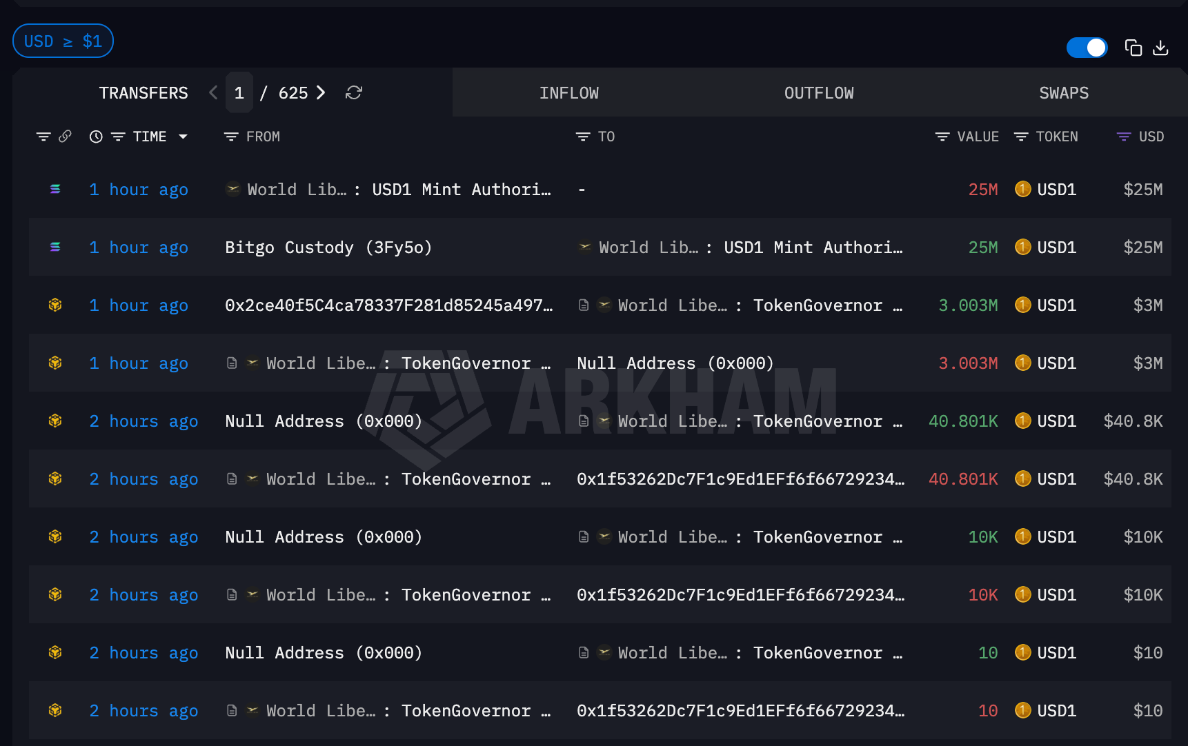 - World Liberty Financial minted 25 million USD1 stablecoins and burned 3 million on Monday, resulting in a net $22 million increase in USD1 circulation as it manages fallout from its Dolomite lending position.